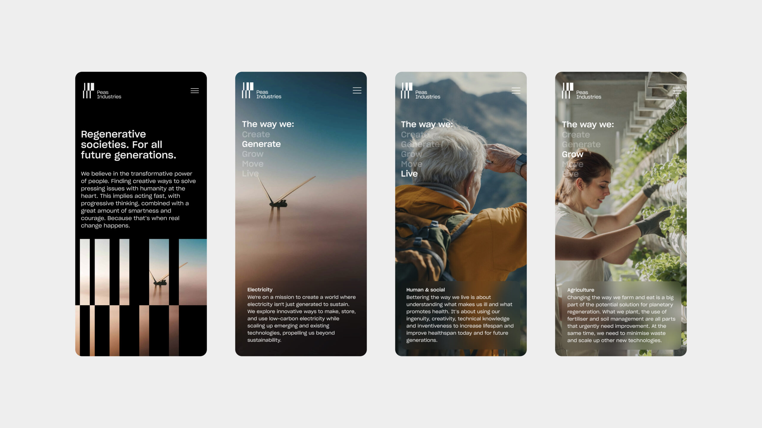 Designed to attract attention, provoke thought, and challenge norms, this branding embodies both attitude and strength. Inspired by peas growing together, it serves as a versatile element within a dynamic graphic system, adaptable for animation, imagery, or standalone use. Complemented by an unconventional color scheme and bold typography, Peas Industries is poised for continued growth and success for years to come.