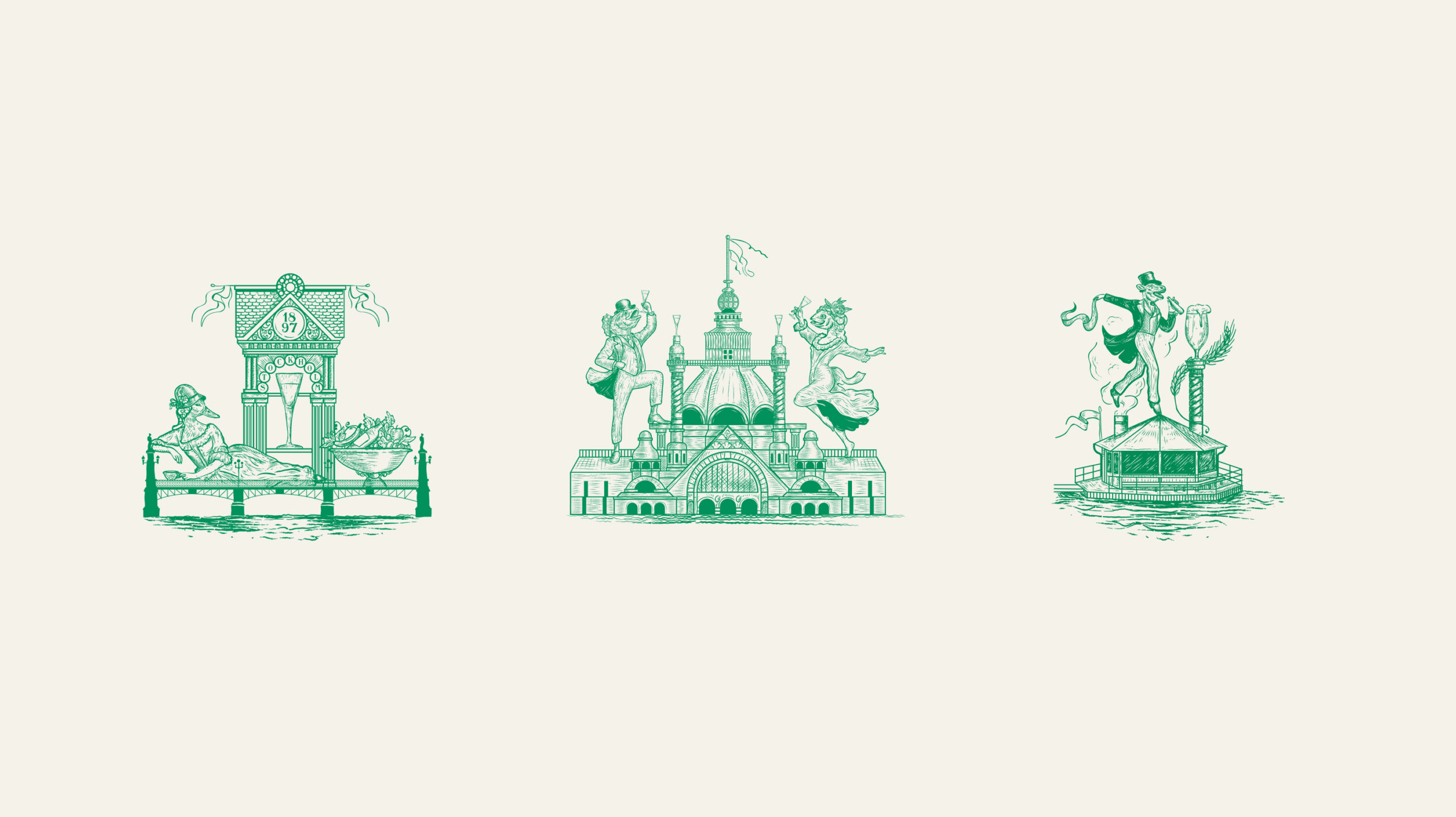 The illustrations build a world that feels timeless yet unexpected. Classic etching style meets playful surrealism with fair-era buildings alongside Djurgården’s wildlife in human form, from ducks in dresses to herring in tophats and even a goat in a suit. It is a bold, dreamlike nod to the fair that keeps the identity fresh and contemporary.